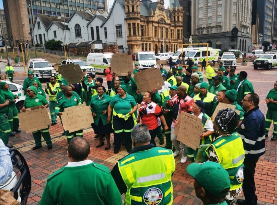 Abasebenzi beenkonzo ezingxamiseko zoMbuso (EMS) eGqeberha bakhokele intaphane yeemoto ezisingise kwiHolo yeSixeko ngoLwesithathu, beyokuvakalisa inkxalabo nodano lwabo kuhlaselo olunobundlongondlongo lwabasebenzi beenkonzo zikaxakeka kwesi sixeko kutshanje.