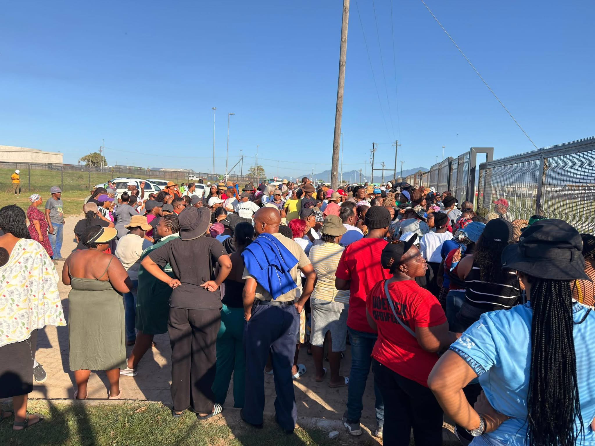 Baphume ngobuninzi abazali babantwana bengingqi yaseGeorge eNtshona Koloni, bengxange ngaphandle kwamasango esikolo samabanga aphantsi iThembalethu Primary School.