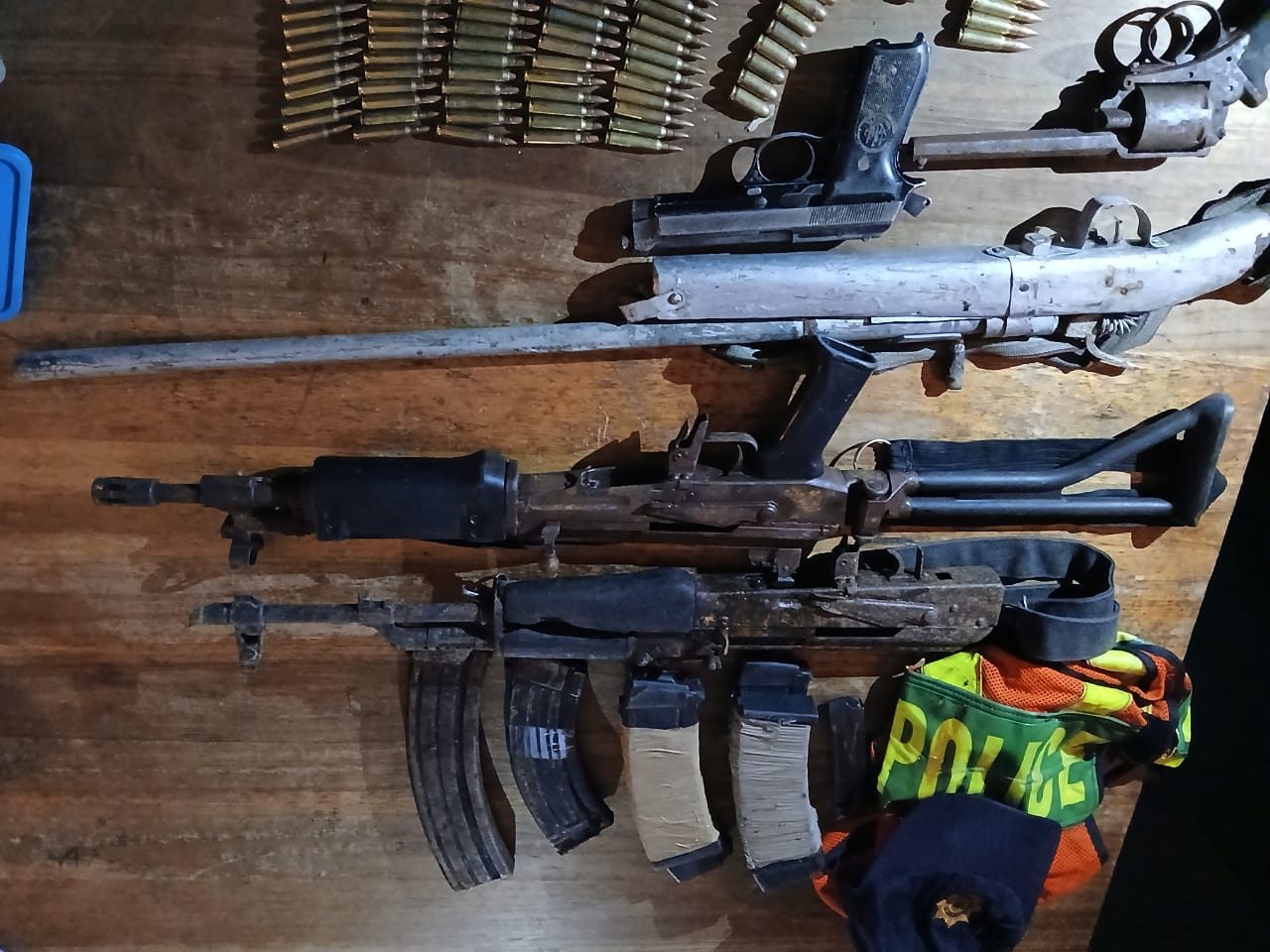 Phakathi kwemipu efunyenweyo ngaphandle kwelayisenisi, yonke lemipu ibingenazo iinombolo zezi; I-R5 Rifle, i-AK 47, i-shotgun, i-pistol kunye ne-.38 Revolver kunye neemagazini eziyi-05 X R5, imagazini i-01 X AK 47, imagazini ye-01 ye-X pistol kunye nentaphane yeembumbulu kunye nezinto ekurhaneleka ukuba zibiwe.