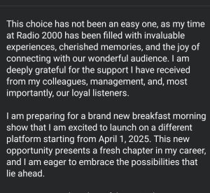 Ubhale wathi kumakhasi onxibelelwano wakhe, “Kubaphulaphuli abahloniphekileyo bakanomathotholo iRadio 2000 nakuluntu loMzantsi Afrika ngokubanzi, oku kukwazisa ukuba emva kokucingisisa, ndithathe isigqibo sokurhoxa ekubeni ngumsasazi wakusasa kwiRadio 2000.”